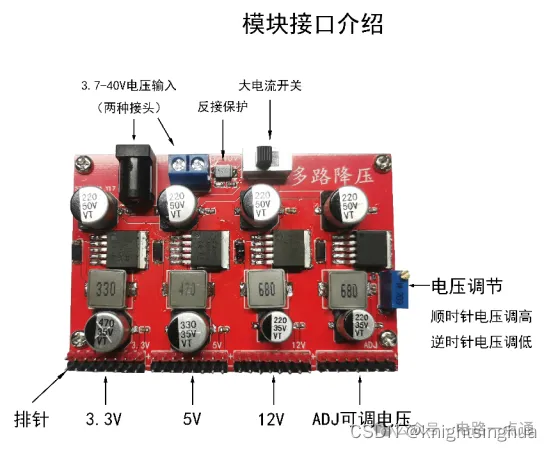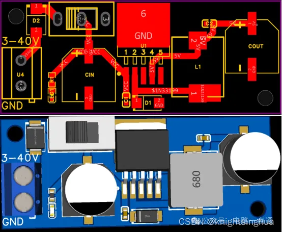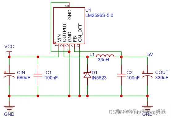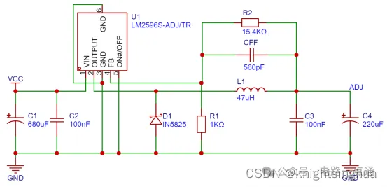 注:图中使用的芯片是LM2596-5.0,即便左侧输入不是12V(但是要高于5V哦,它是降压芯片,不是升压芯片),右侧依然可以固定输出5V电压。