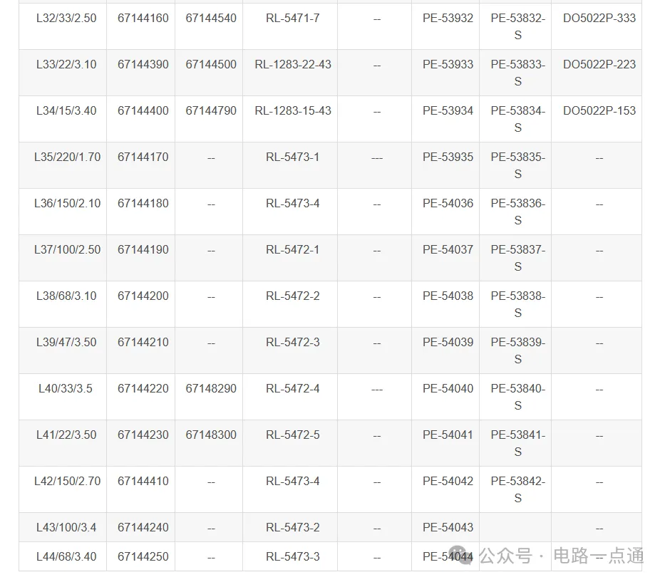 因为所需的电感值为 33μH,从上表中 L40 那行所列的 4 个厂家的电感序列号中选择一个电感(通常,表贴和直插的电感都有),最好使用磁屏蔽结构的电感器。