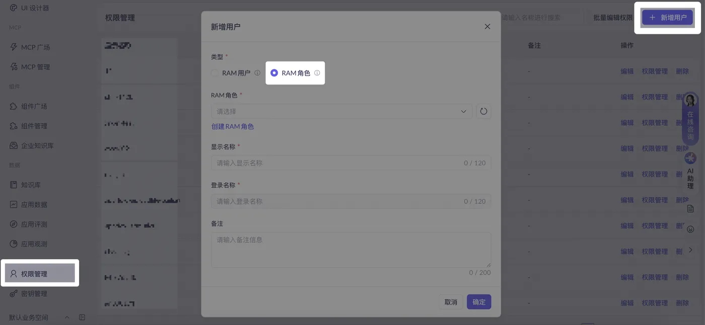 - 访问百炼 权限管理,选择新增用户 —— RAM角色,选择刚刚在AppFlow创建凭证选择或新建的角色。