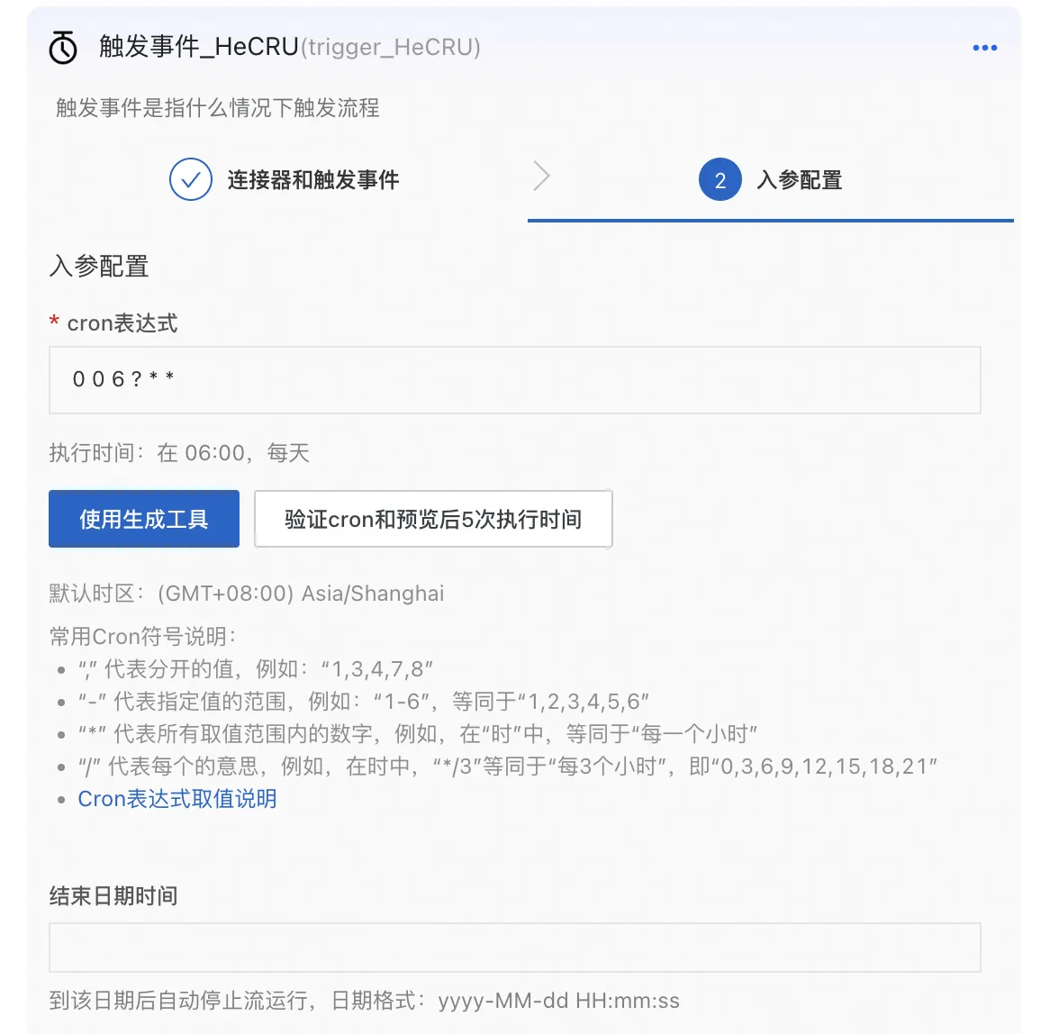- 点击触发事件 - 下一步,填写需要同步的频率。例如 每天早上6点更新同步。
