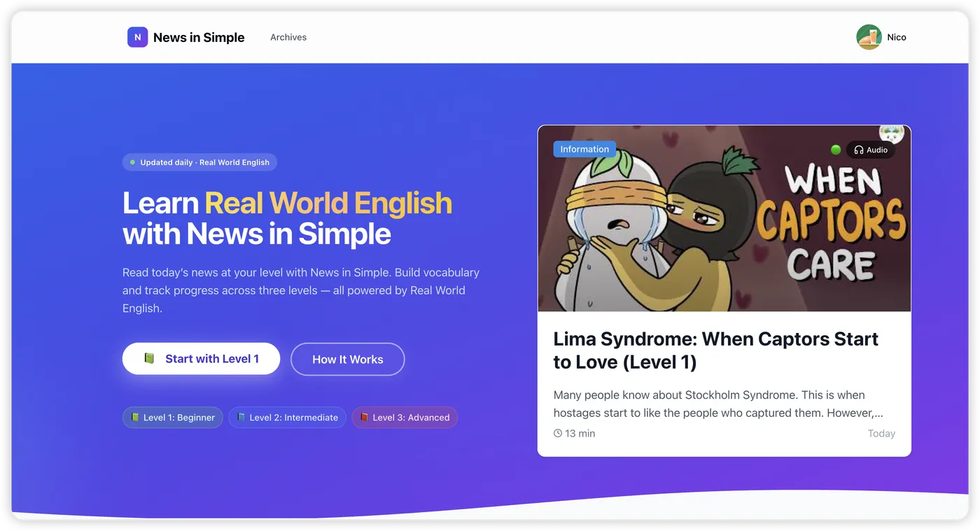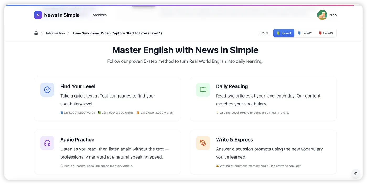 既然 LLM(大模型)具备了极强的 NLP 能力,我决定自己开发一个工具,对真实世界的英语新闻进行 Refactoring(重构)。这就是 News In Simple 的诞生逻辑。