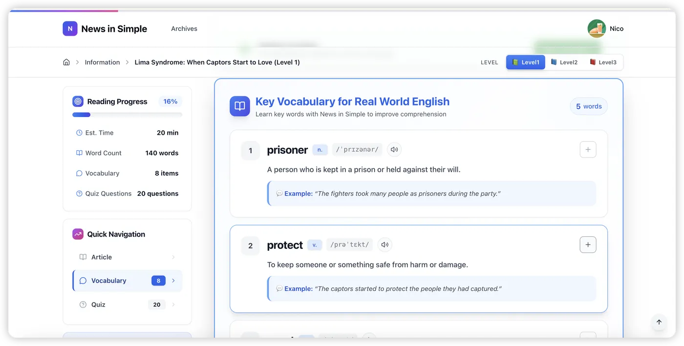 在 News In Simple 中,我利用 LLM 的 Context Window,提取的 Key Vocabulary 不仅仅是单词本身,而是包含了该单词在当前新闻上下文中的具体实例化对象。这就像 IDE 里的“跳转到定义”,直接把你带到了具体的实现逻辑中,而不是泛泛的文档。
