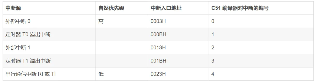 MCS-51 单片机中断源的自然优先级、入口地址及中断编号