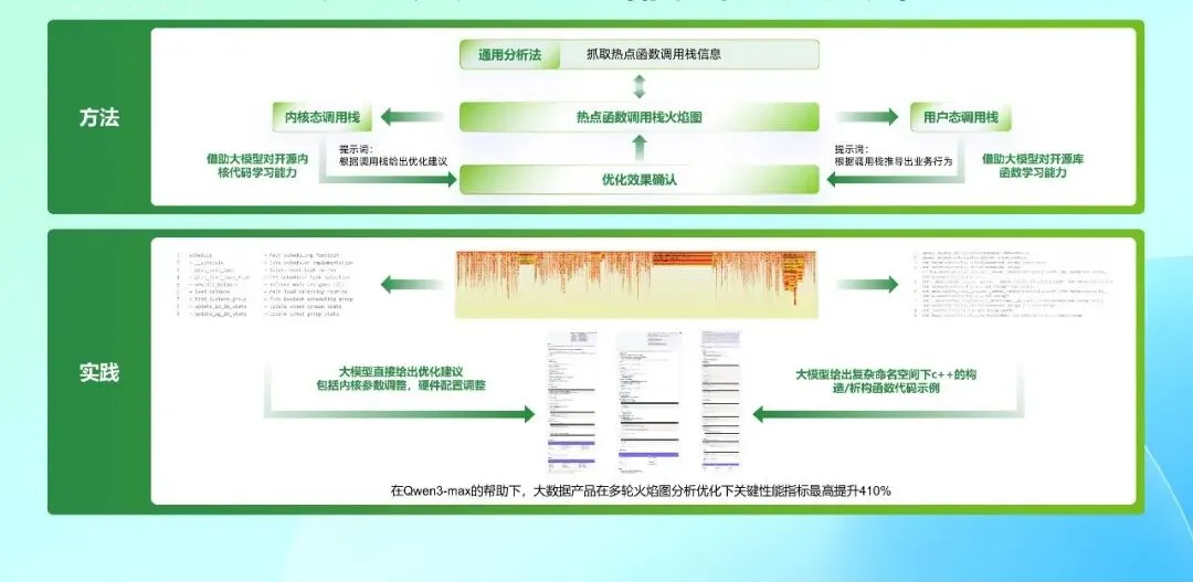 值得一提的是,阿里云正积极探索大模型在性能优化中的应用。借助 Qwen 等大模型对 Linux 内核的深度理解能力,团队开发出智能化火焰图分析流程:自动剥离用户态与内核态调用栈,分别交由大模型解析,快速定位热点函数并生成优化建议。这一方法大幅缩短了传统性能调优周期,为人机协同的智能优化开辟新路径。