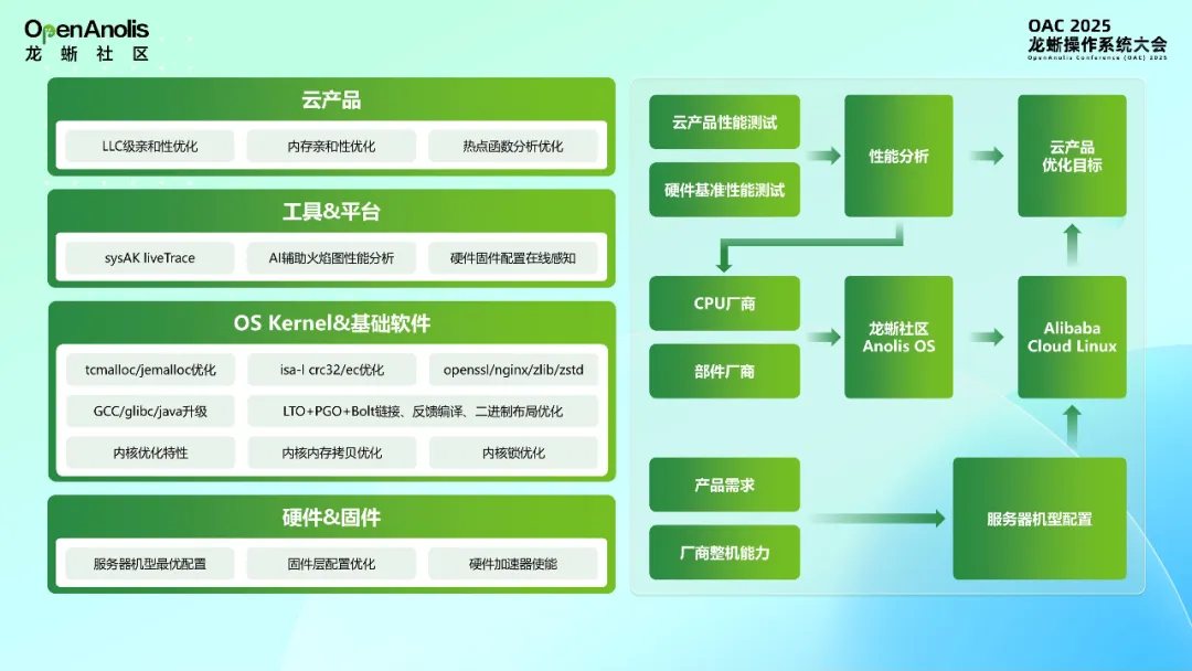 对此,阿里云依托自研服务器操作系统 Alibaba Cloud Linux(基于龙蜥操作系统 Anolis OS 深度定制),联合国产 CPU 厂商、龙蜥社区及云产品研发团队,构建了一套覆盖“硬件—操作系统—云产品”全栈的性能优化体系,并在本次大会上系统地披露其核心技术路径。