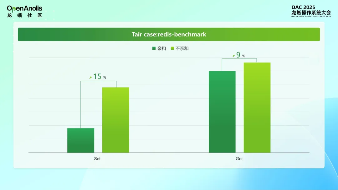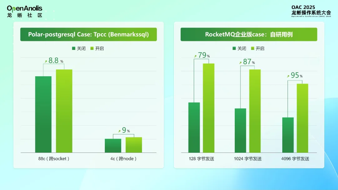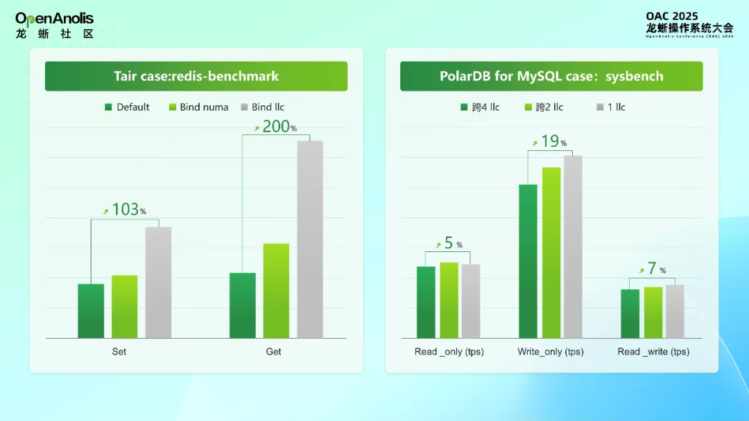 将应用关键进程/线程优先限制在单个 LLC 共享核范围内,当应用并发进程/线程数量较多超出 1 个或多个 LLC 时,则最小化跨 LLC 调度,并优先选择物理距离最近的缓存单元。实测显示,该优化使云数据库 Tair 性能最高提升达 2 倍,PolarDB for MySQL 典型 4C 实例规格在跨 4 个 LLC 到不跨 LLC 情况下性能提升近 20%。