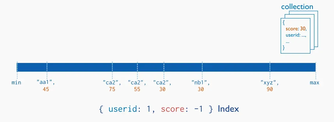 MongoDB还支持多个字段的用户定义索引,即复合索引(Compound Index)。复合索引中列出的字段顺序具有重要意义。例如,如果复合索引由 { userid: 1, score: -1 } 组成,则索引首先按userid正序排序,然后在每个userid的值内,再在按score倒序排序。