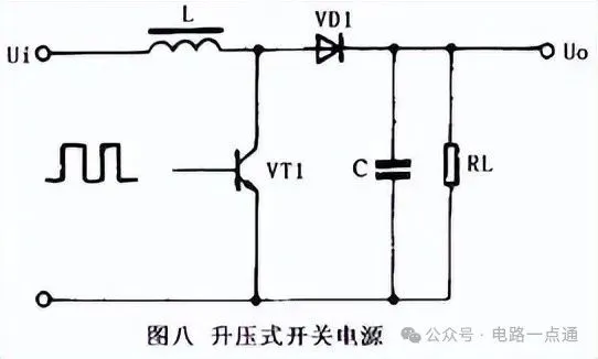 升压式开关电源的稳压电路如图八所示。当开关管 VT1 导通时,电感L储存能量。当开关管VT1 截止时,电感L感应出左负右正的电压,该电压叠加在输人电压上,经二极管VD1向负载供电,使输出电压大于输人电压,形成升压式开关电源。