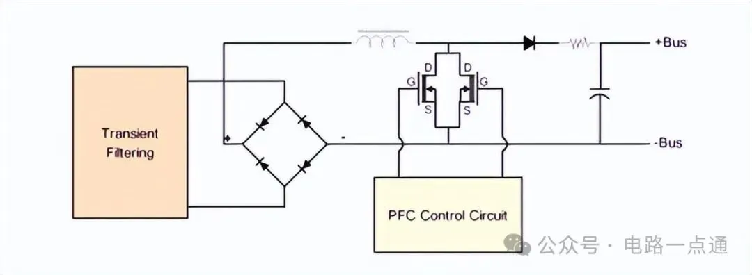 主动式PFC开关电源工作原理:主动式PFC电路通常使用两个功率MOSFET开关管。这些开关管一般都会安置在一次侧的散热片上。为了易于理解,我们用在字母标记了每一颗MOSFET开关管:S表示源极(Source)、D表示漏极(Drain)、G表示栅极(Gate)。