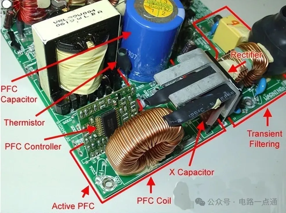 主动式PFC开关电源工作原理:PFC二极管是一颗功率二极管,通常采用的是和功率晶体管类似的封装技术,两者长的很像,同样被安置在一次侧的散热片上,不过PFC二极管只有两根针脚。PFC电路中的电感是电源中最大的电感;一次侧的滤波电容是主动式PFC电源一次侧部分最大的电解电容。主动式PFC控制电路通常基于一颗IC整合电路。