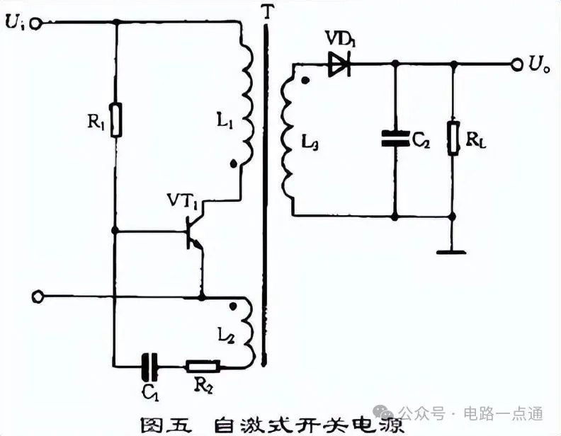 自激式开关稳压电源的典型电路如图五所示。这是一种利用间歇振荡电路组成的开关电源,也是目前广泛使用的基本电源之一。