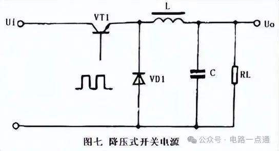 降压式开关电源的典型电路如图七所示。当开关管VT1 导通时,二极管VD1 截止,输人的整流电压经VT1和L向C充电,这一电流使电感L中的储能增加。当开关管VT1截止时,电感L感应出左负右正的电压,经负载RL和续流二极管VD1释放电感L中存储的能量,维持输出直流电压不变。电路输出直流电压的高低由加在VT1基极上的脉冲宽度确定。