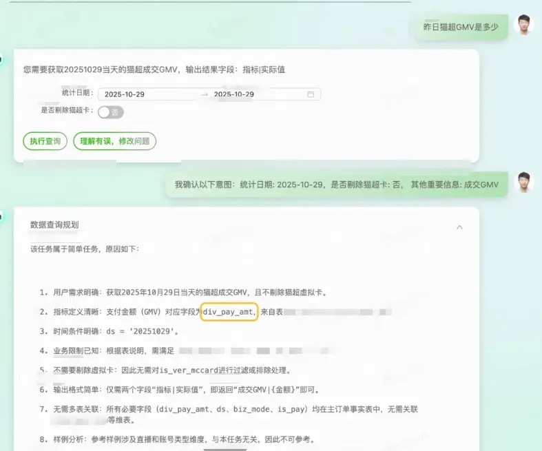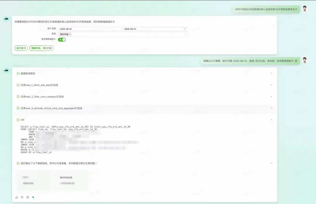 1. 用户需求输入与意图解析,对用户输入进行意图识别解析,例如“今年618期间百亿补贴渠道的gmv是多少?”,提取其中日期、渠道以及计算指标并与用户二次确认。