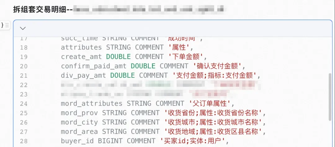 基于以上方案,结合元数据,对表、字段、指标等进行了评估和筛选,借助大模型能力对提取表、字段关键词并进行泛化,对DDL进行优化和标准化,构建知识库。以下为重点构建案例。