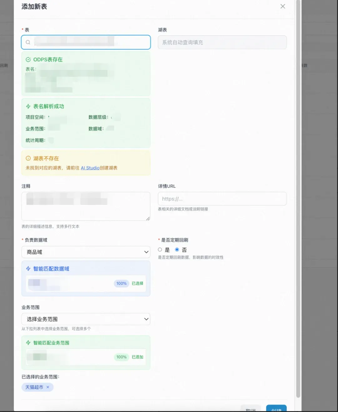 1.业务范围、基础描述、词根必填,业务范围是中文单词(比如天猫超市),基础描述应该是这个业务范围的实际经营范围,词根是中译英的单词缩写,也应当与 建表规范一致。 |