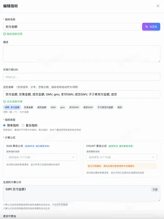 1.指标名称、指标类型、计算公式、负责数据域必填 2.指标名称和泛化词均会和系统里的历史记录进行重复校验。 3.指标类型划分为简单指标和复合指标: a.简单指标适用于自身指标求和或单属性去重计算;简单指标是通过匹配属性/指标自动生成公式 b.复合指标适用于其他所有指标;而复合指标只输入公式,系统自动校验公式是否符合语法,并识别属性/指标,如果发现不合法子字符串,则该公式会被打上无效标签,不会给到大模型 |