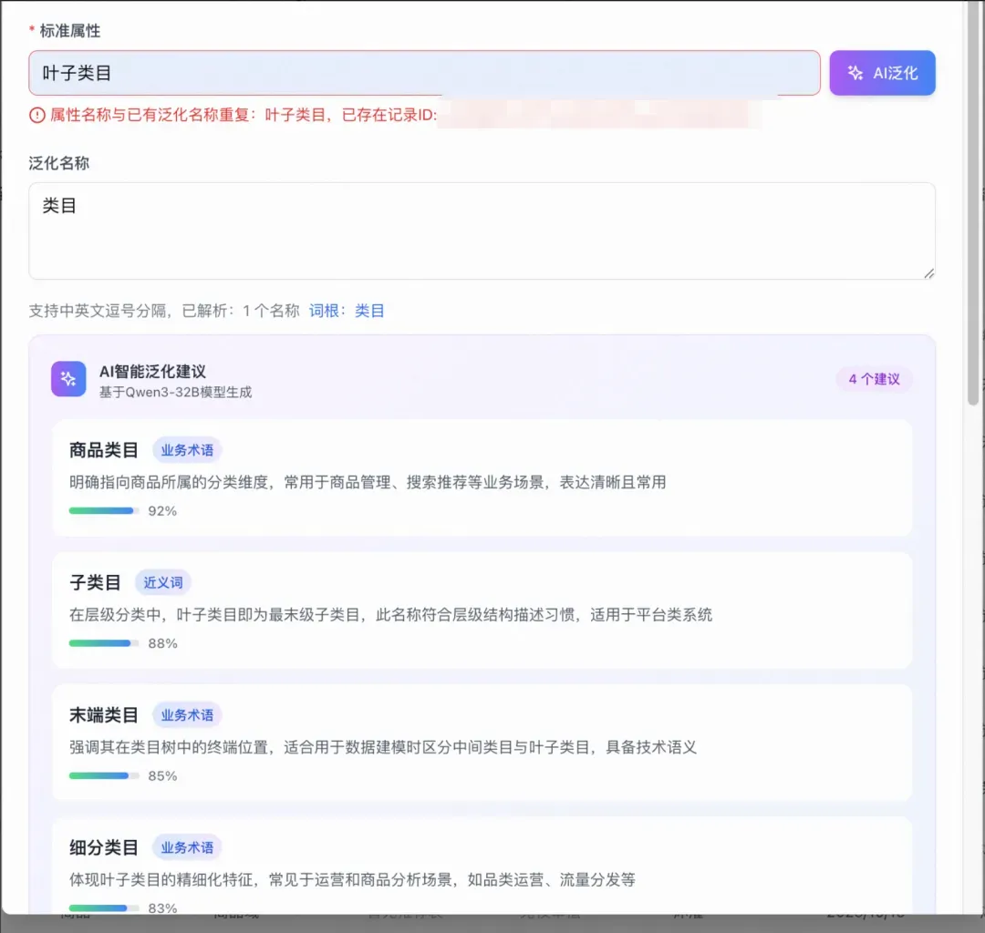 平台通过上图的产品设计,首先尽量减少重复输入,用关联替代输入。其次利用数据库查询和大模型文本生成的能力,泛化词生成和判重已经不需要人工写入。 |