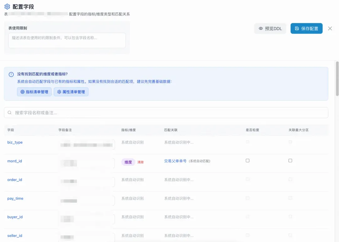 1.作为知识光维护表是不够的,还需要维护表中的字段,进入到字段管理中 2.配置字段中,正常流程中研发必须且仅需维护 是否粒度,告知这张表的主键。 3.研发不需要完全维护这张表的所有字段,这张表最终也不会完全透出,透出范围仅由关联到 指标/维度的选项 清单范围决定。 4.系统会自动 根据 字段名/字段备注(优先字段名)结合维护的知识库元数据,自动识别 具体的指标/维度,原则上,研发不需要自己进行操作,只需要确认。 |