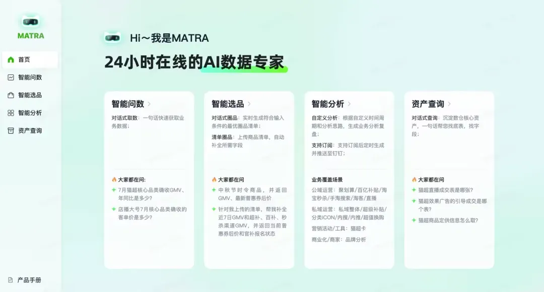 在此背景下,我们启动 Matra 项目 —— 一款面向猫超场景的 AI 数据助手,旨在通过自然语言交互实现“低门槛、高灵活性”的智能取数与分析服务,让AI能像专业的数据工程师、数据分析师一样,听懂业务问题、自动规划取数路径、生成并执行SQL并输出洞察结论,实现从“人找数”到“AI取数、分析、用数”的转变。