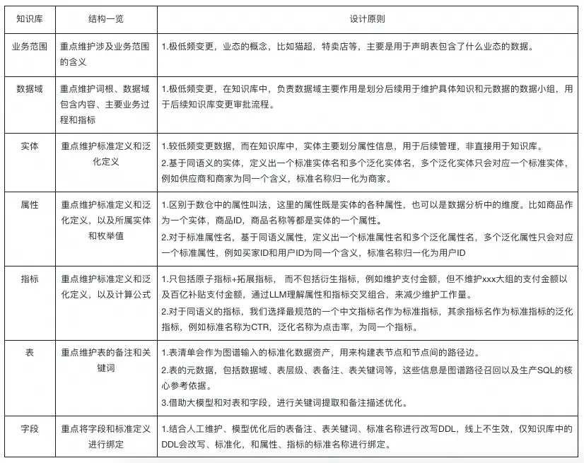 1.有效性:知识库结构中需要同时维护 实体、属性、指标、表、DDL信息 五类知识,这些知识必须是可关联的信息才可以被大模型理解,否则问数任务在大模型执行中可能因某个知识无法与其他知识关联,扩大大模型幻觉的概率。