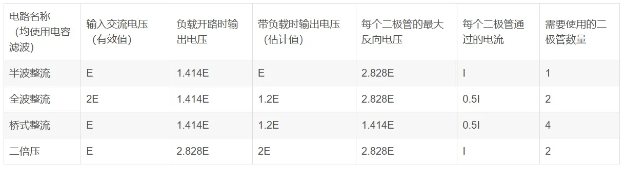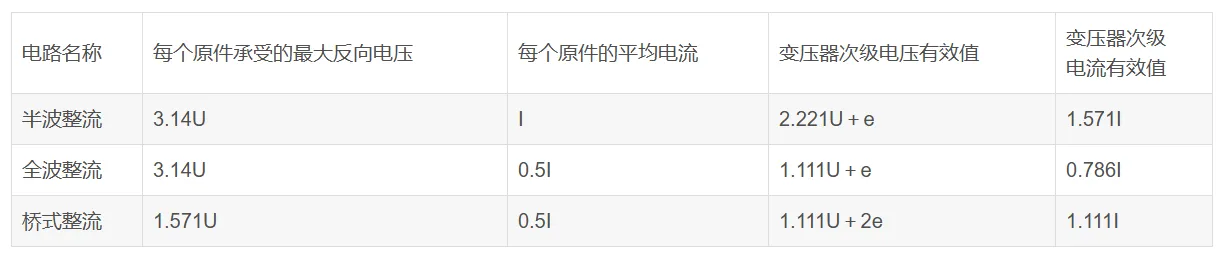 (1)常用整流电路性能对照