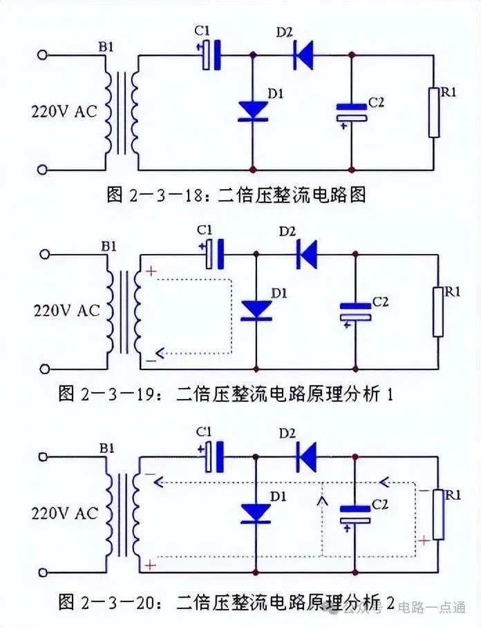 前面介绍的三种整流电路输出电压都小于输入交流电压的有效值,如果需要输出电压大于输入交流电压有效值时可以采用倍压电路,见图2-3-18。由图 2-3-19可知,在电源的正半周,变压器B1次级上端为正下端为负,D1导通,D2截止,C1通过D1充电,充电后C1两端电压接近B1次级电压峰值,方向为左端正右端负;由图2-3-20可知,在电源的负半周,变压器B1次级上端为负下端为正,D1截止,D2导通,C2通过D1充电,充电后C2两端电压接近C1两端电压与B1次级电压峰值之和,方向为下端正上端负。由于负载R1与C1并联,当R1足够大时,R1两端的电压即为接近2倍B1次级电压。