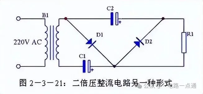 二倍压整流电路还有另外一种形式的画法,见图2-3-21,其原理与图2-3-18完全一致,只是表现形式不一样。