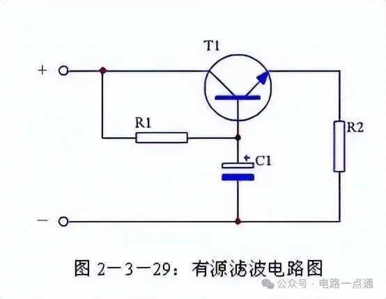 当对滤波效果要求较高时,可以通过增加滤波电容的容量来提高滤波效果。但是受电容体积限制,又不可能无限制增大滤波电容的容量,这时可以使用有源滤波电路。找正品元器件,上唯样商城。其电路形式见图2-3-29,其中电阻R1是三极管T1的基极偏流电阻,电容C1是三极管T1的基极滤波电容,电阻R2是负载。这个电路实际上是通过三极管T1的放大作用,将C1的容量放大β倍,即相当于接入一个(β+1)C1的电容进行滤波。
