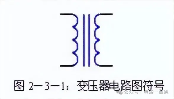 通常直流稳压电源使用电源变压器来改变输入到后级电路的电压。电源变压器由初级绕组、次级绕组和铁芯组成。初级绕组用来输入电源交流电压,次级绕组输出所需要的交流电压。通俗的说,电源变压器是一种电→磁→电转换器件。即初级的交流电转化成铁芯的闭合交变磁场,磁场的磁力线切割次级线圈产生交变电动势。次级接上负载时,电路闭合,次级电路有交变电流通过。变压器的电路图符号见图2-3-1。
