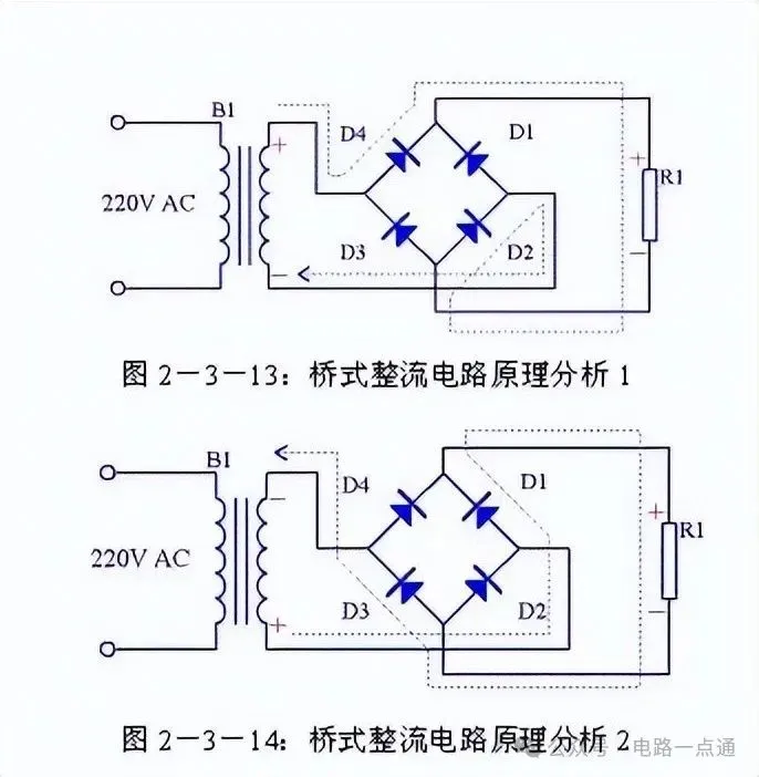 由图2-3-13可以看出在电源正半周时,B1次级上端为正,下端为负,整流二极管D4和D2导通,电流由变压器B1次级上端经过D4、R1、D2回到变压器B1次级下端;由图2-3-14可以看出在电源负半周时,B1次级下端为正,上端为负,整流二极管D1和D3导通,电流由变压器B1次级下端经过 D1、R1、D3回到变压器B1次级上端。R1两端的电压始终是上正下负,其波形与全波整流时一致。
