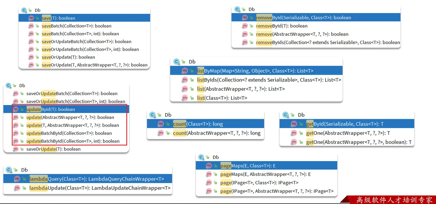前面我们在mapper层或者service完成了各种CRUD,但是MP也提供了一个静态工具类:Db,这里面也封装了日常需要使用的接口方法,以解决:service之间相互引入,嵌套引入导致的循环依赖问题。其API如下
