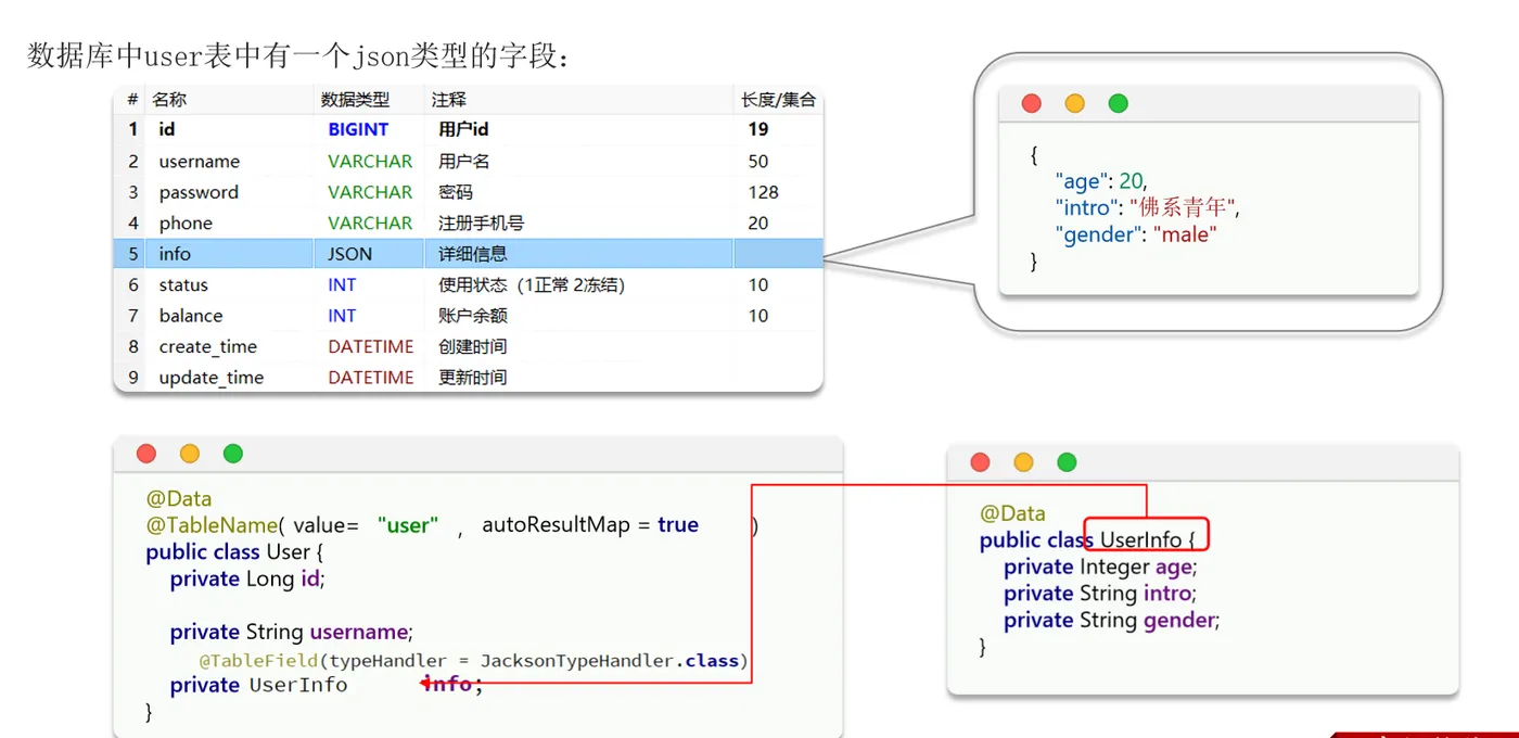 当数据库中有一个JSON类型字段时,MP依然做了支持,只需要在对应属性值追加下面截图注解即可。