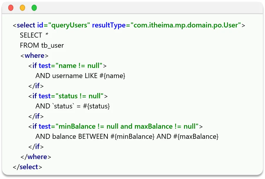 public List<User> queryUserList(String name, Integer status, Integer minBalance, Integer maxBalance) { return lambdaQuery() .like(null != name, User::getUsername, name) .eq(null != status, User::getStatus, status) .between(null != minBalance && null != maxBalance, User::getBalance, minBalance, maxBalance) .list(); }