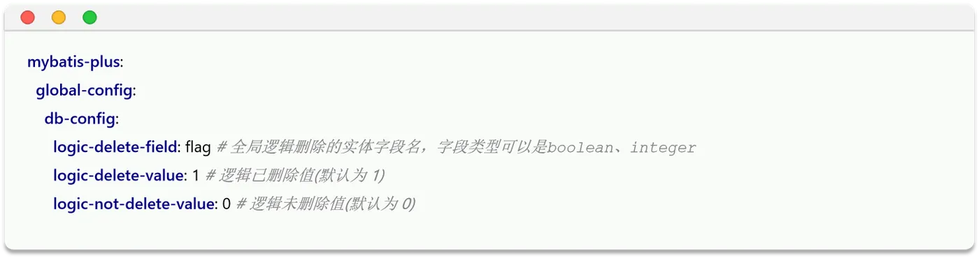 MybatisPlus提供了逻辑删除功能,无需改变方法调用的方式,而是在底层帮我们自动修改CRUD的语句。我们要做的就是在application.yaml文件中配置逻辑删除的字段名称和值即可: