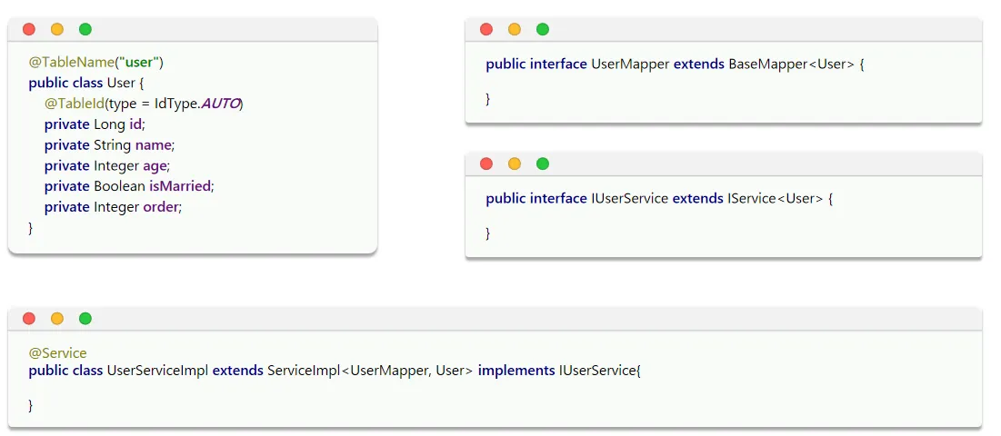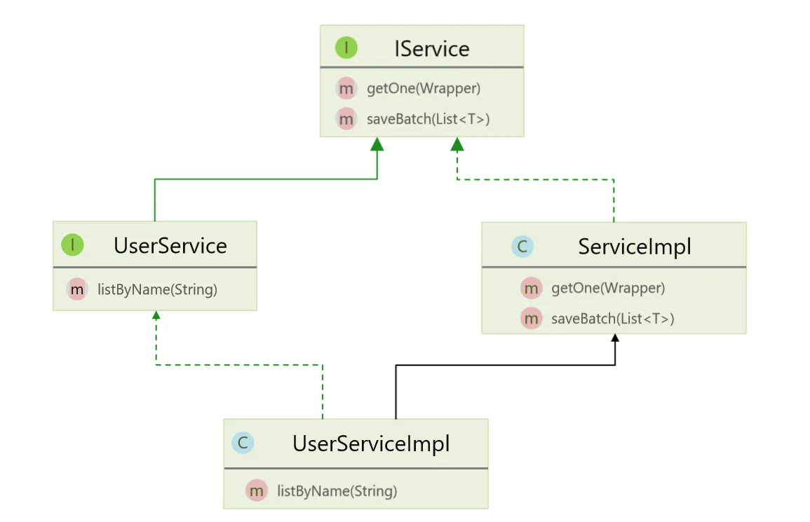 比如上述的批量新增、批量更新、查询单个、批量删除、分页等都是非常实用的。而要去实现这个功能就不能像原来Mapper层一样直接继承BaseMapper了,因为接口是有实现类的,所以我们遵循下面这一套规范: