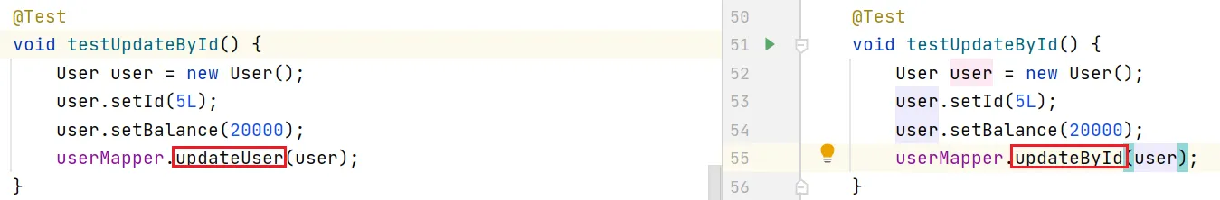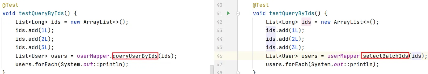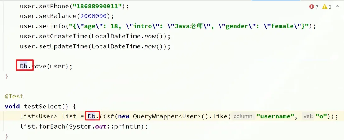 @Test void testUserFormatSql() { List<Long> ids = Arrays.asList(1L, 2L, 4L); int amount = 200; // 1.构建条件 LambdaQueryWrapper<User> wrapper = new LambdaQueryWrapper<User>() .in(User::getId, ids); // 2.自定义SQL方法调用 userMapper.updateBalanceByIds(wrapper, amount); }