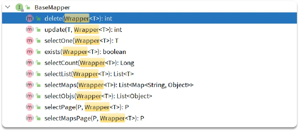 MyBatisPlus支持各种复杂的where条件,可以满足日常开发的所有需求。当我们继承BaseMapper之后,就具备了一些常见的接口方法