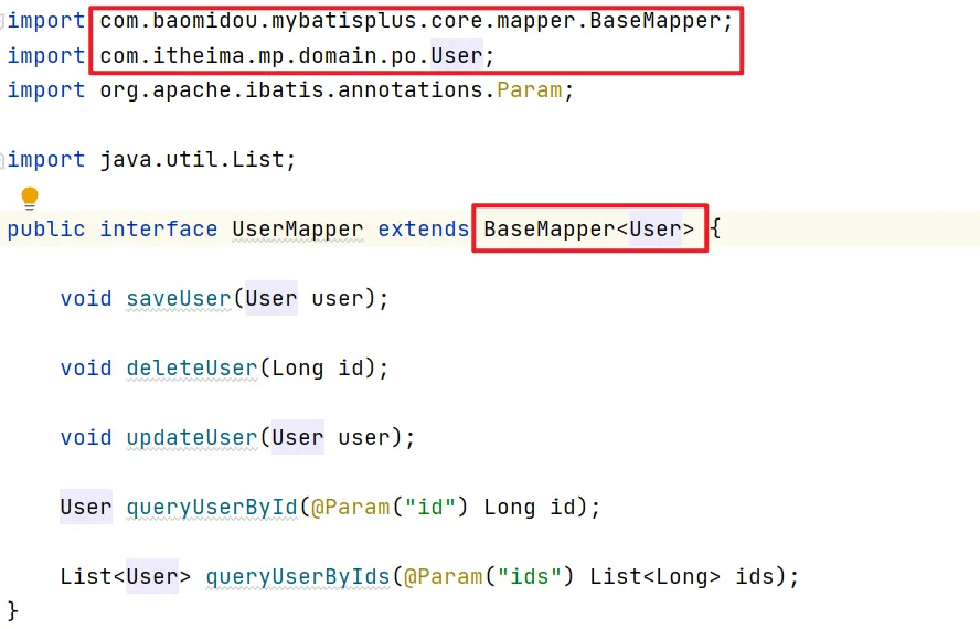 然后我们在自己的mapper接口中继承BaseMapper,并声明泛型对应的实体类就可以有常见的CRUD代码了。