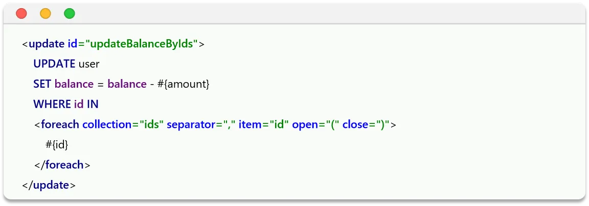 <update id="updateBalanceByIds"> UPDATE tb_user SET balance = balance - #{amount} ${ew.customSqlSegment} </update>