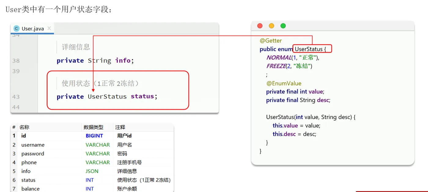 当数据库是status是int类型,为了实现PO类中的枚举类型变量与数据库字段的转换,我们就可以借助:@EnumValue 注解将其做映射,无需特殊处理