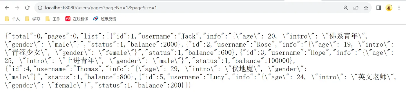 { "total":1005, "pages":201, "list":[ { "id":1, "username":"Jack", "info":{ "age":21, "gender":"male", "intro":"佛系青年" }, "status":"正常", "balance":2000 }, { "id":2, "username":"Rose", "info":{ "age":20, "gender":"female", "intro":"文艺青年" }, "status":"冻结", "balance":1000 } ] } |