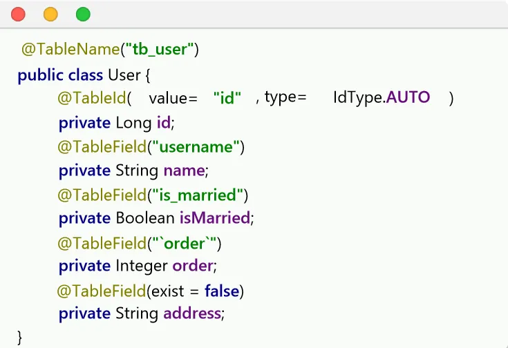 但是上述的都是正常情况,如果存在一些异常:如表名跟实体类不一样、实体类部分字段表中没有等,就可以通过一些常见注解来完成映射了,MybatisPlus中比较常用的几个注解如下: