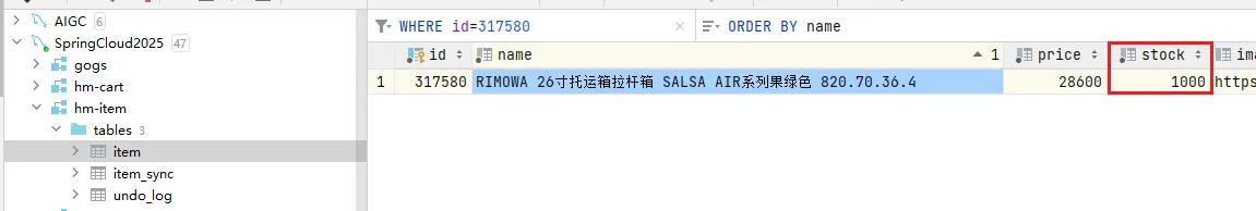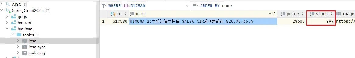 上图中其中一个分支事务27595734695333932即商品服务已经成功扣减库存,我们可以观察hm-item数据库的item表的stock字段值