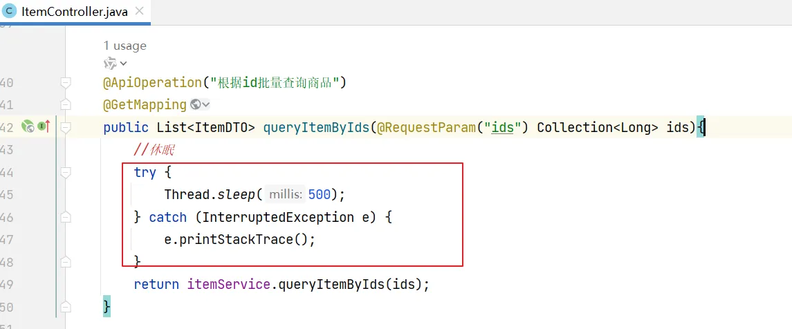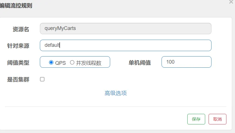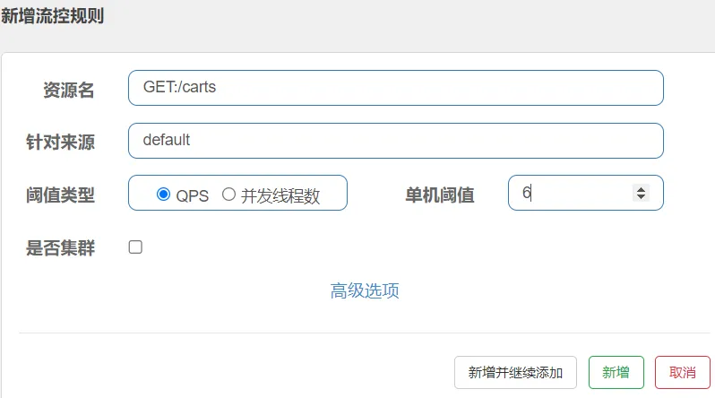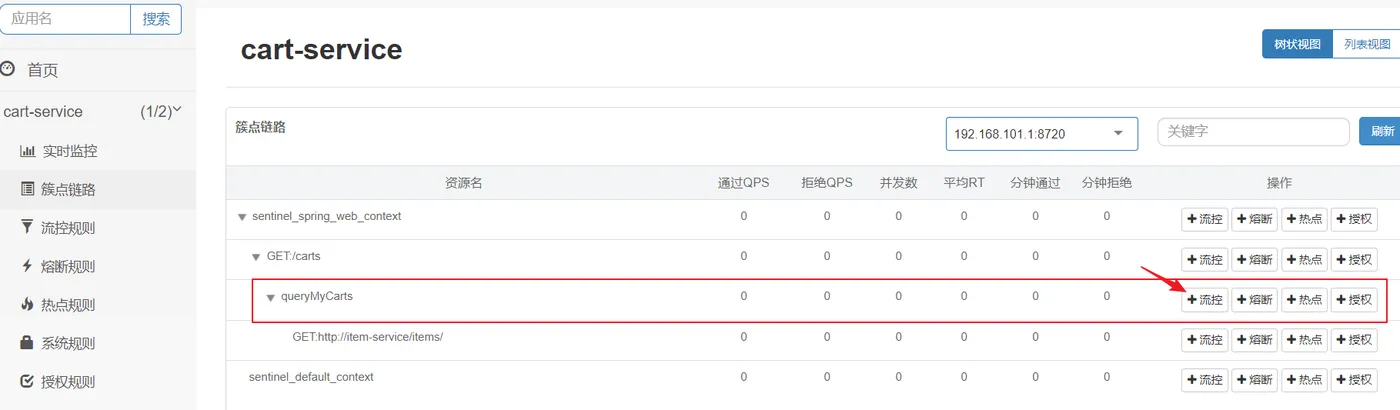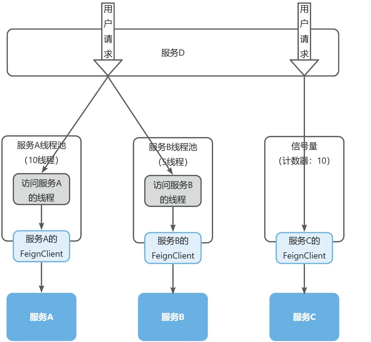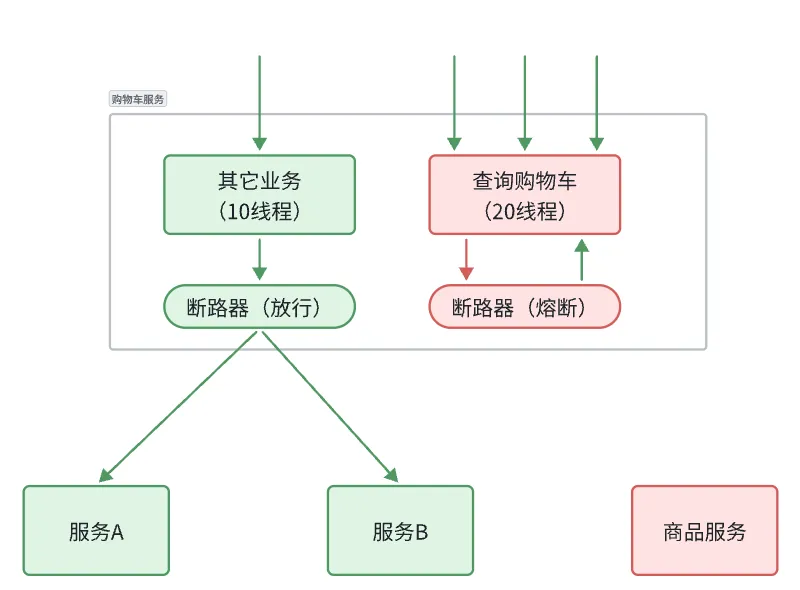 如图所示,我们给查询购物车业务限定可用线程数量上限为20,这样即便查询购物车的请求因为查询商品服务而出现故障,也不会导致服务器的线程资源被耗尽,不会影响到其它接口。