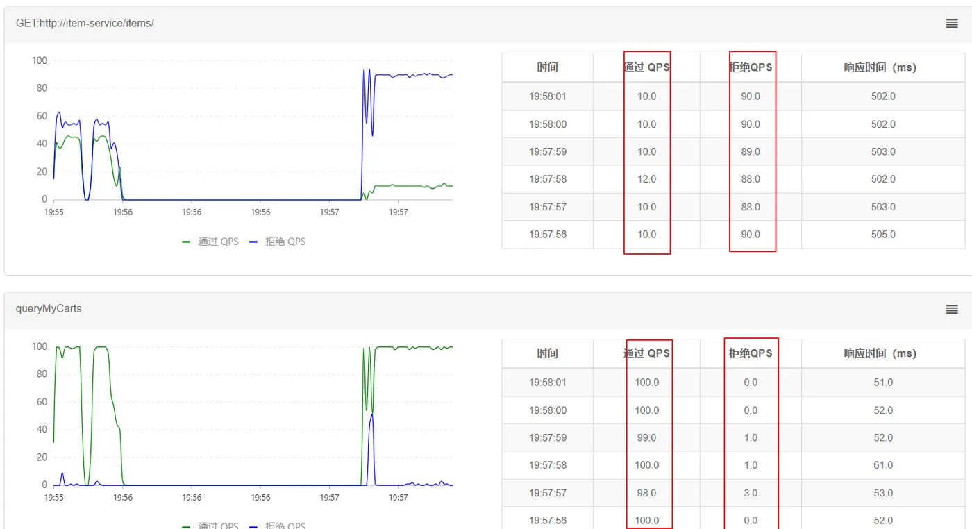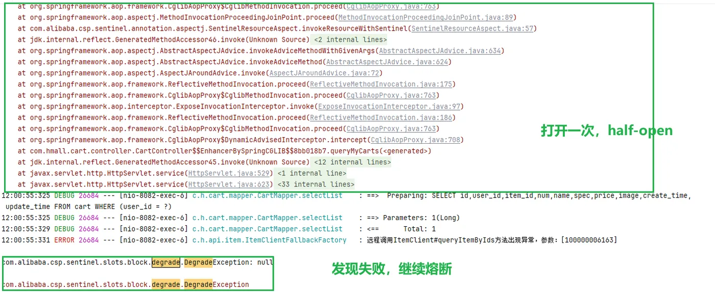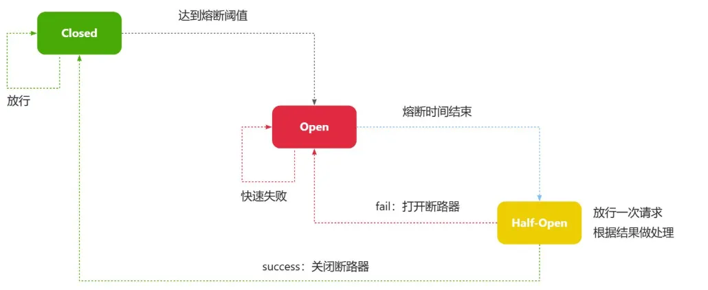 - half-open:半开状态,放行一次请求,根据执行结果来判断接下来的操作。