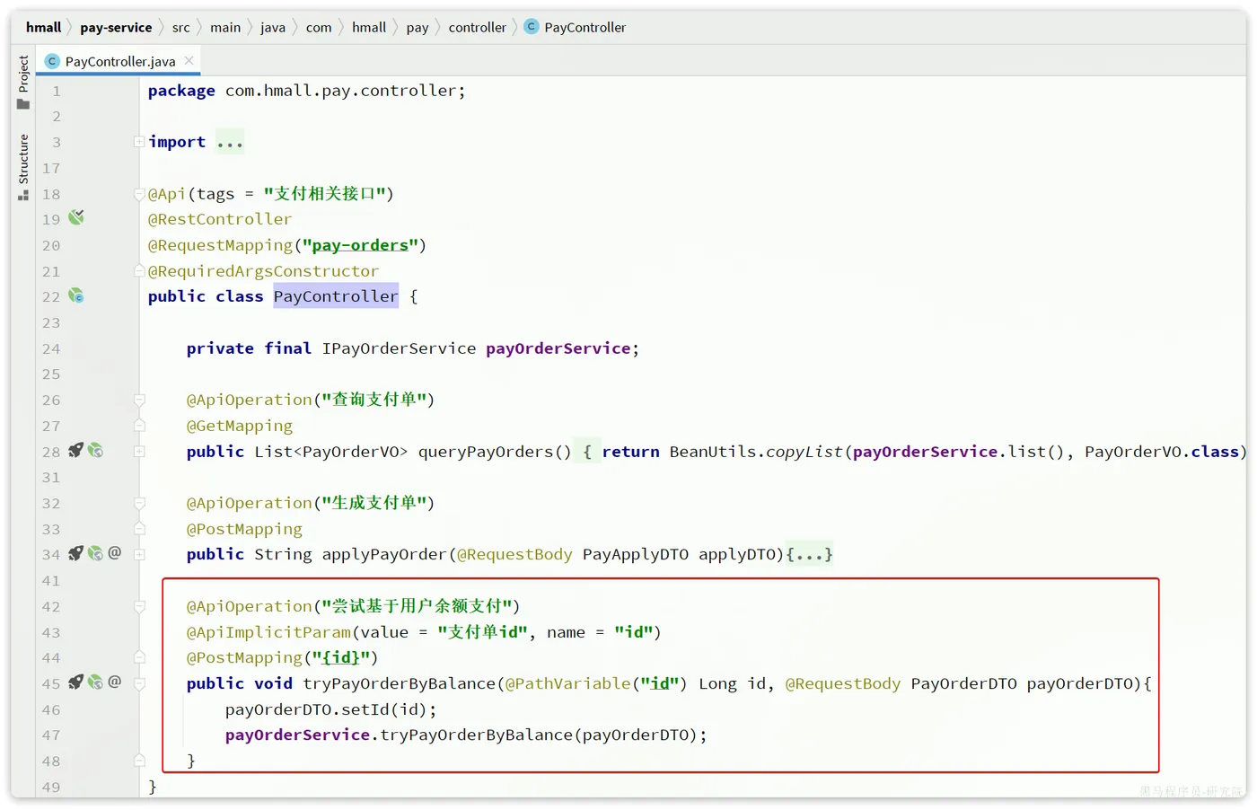 前端会提交支付请求,业务接口的入口在com.hmall.pay.controller.PayController类的tryPayOrderByBalance方法: