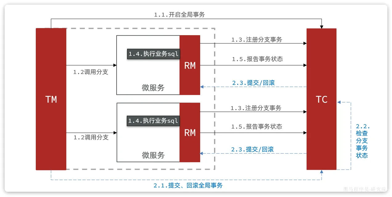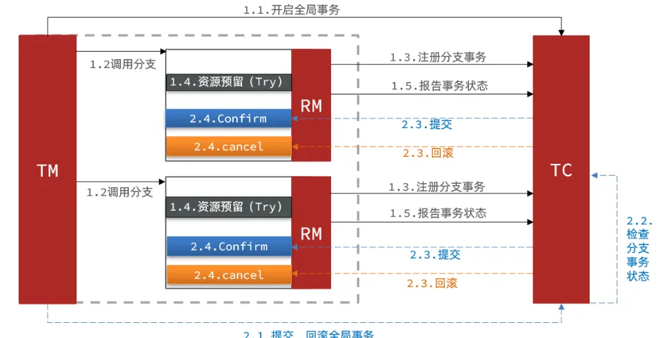 Seata中的TCC模型依然延续之前的事务架构,如图: