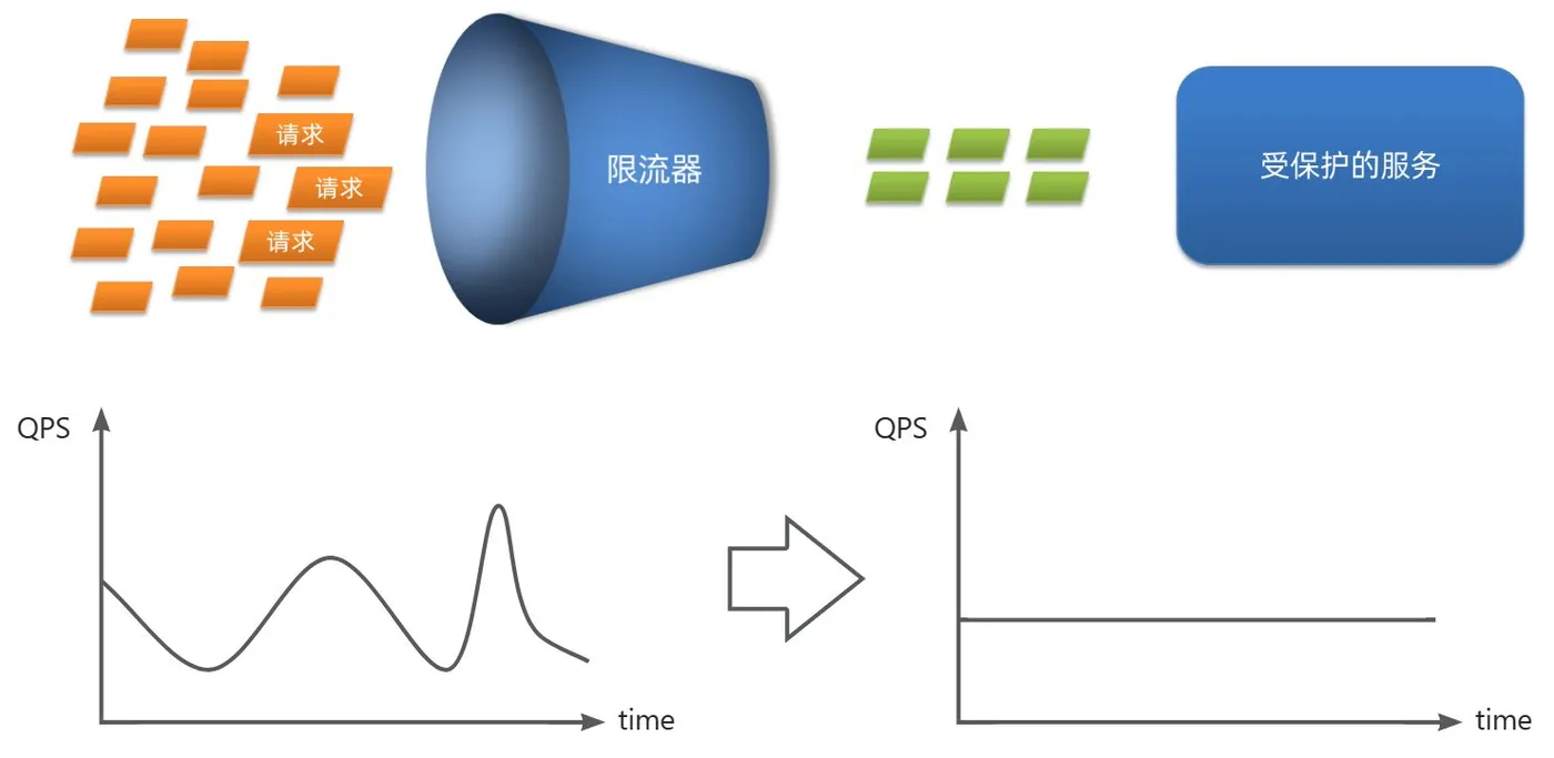 限流往往会有一个限流器,数量高低起伏的并发请求曲线,经过限流器就变的非常平稳。这就像是水电站的大坝,起到蓄水的作用,可以通过开关控制水流出的大小,让下游水流始终维持在一个平稳的量。