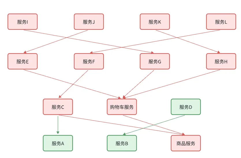 依次类推,整个微服务群中与购物车服务、商品服务等有调用关系的服务可能都会出现问题,最终导致整个集群不可用。