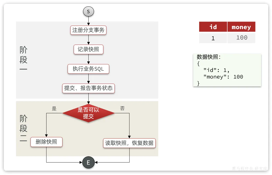 - 如果有分支事务失败,需要回滚。读取快照数据({"id": 1, "money": 100}),使用快照恢复数据库,此时数据库再次恢复为100。